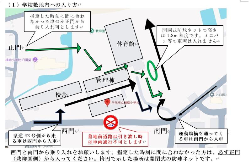 〇学校が定めている「進入禁止のスペース(体育館玄関前、職員玄関前)」には敷地内事故防止の観点から、特別な理由が無い限り車の侵入はご遠慮くださいますようお願いいたします。
