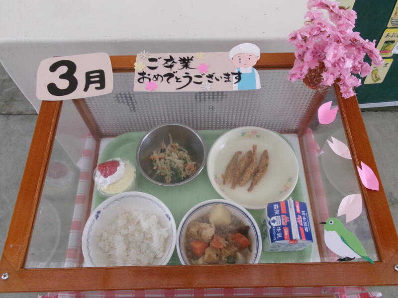3月のステキな飾りの下には、美味しい給食が・・・。この日は、いちごプリンも手作りするとあって、給食室はとても忙しそうでした。おいしい手作りデザートに子どもたちは大喜びでした。