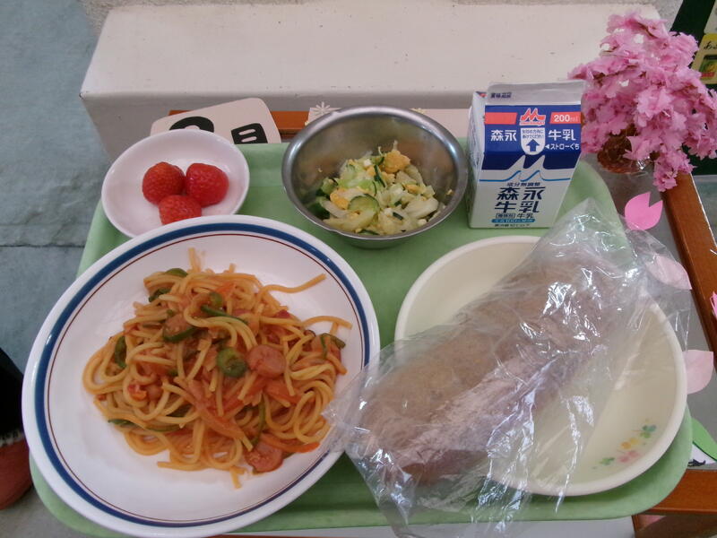 【スパゲティナポリタン、牛乳、揚げパン、ミモザサラダ、いちご】