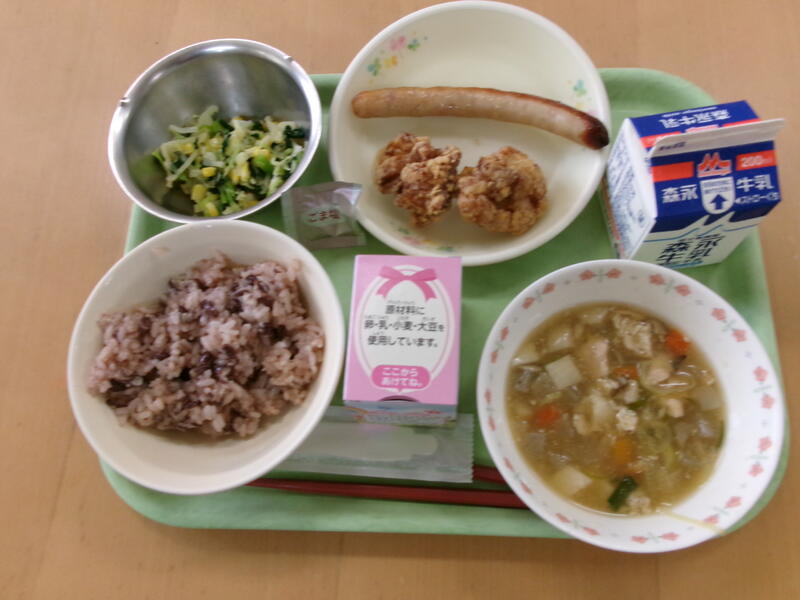 【赤飯、牛乳、鶏のから揚げ、ウィンナー、のっぺい汁、菜の花和え、お祝いケーキ】