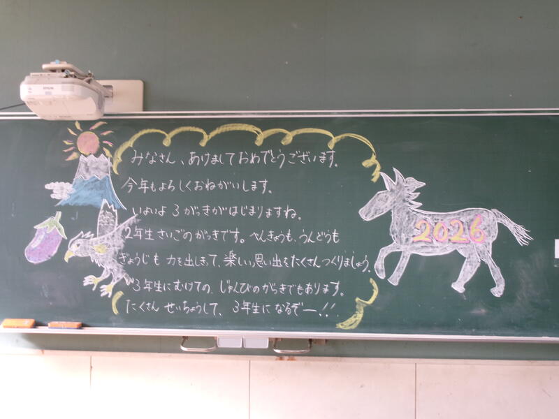 職員も、子どもたちと、新たなスタートができるように、絵や、メッセージ、おみくじなど、様々な準備をしたようです。3学期は短い期間ですが、矢部っこがより成長できるよう、職員みんなで頑張っていきたいと思います。