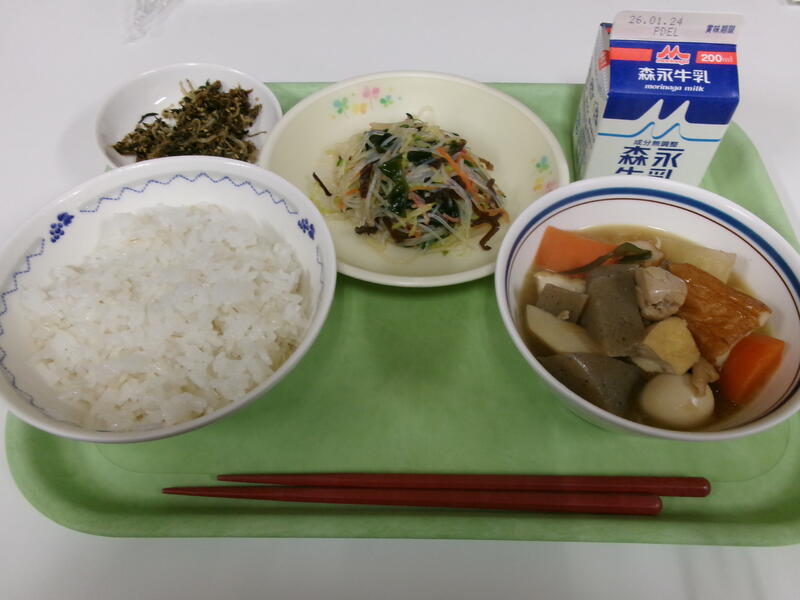 今日の給食は、【麦ごはん、牛乳、おでん風煮、春雨の酢の物、小松菜のふりかけ】です。