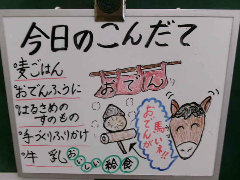 どの料理もとてもおいしかったのですが、「小松菜のふりかけ」が印象的な給食でした。体に良くて、栄養満点の手作りふりかけで、ごはんが、ぱくぱくと進みました。おでん風煮も、春雨も、子どもたちが食べやすい味付けがしてあり、美味しかったです。