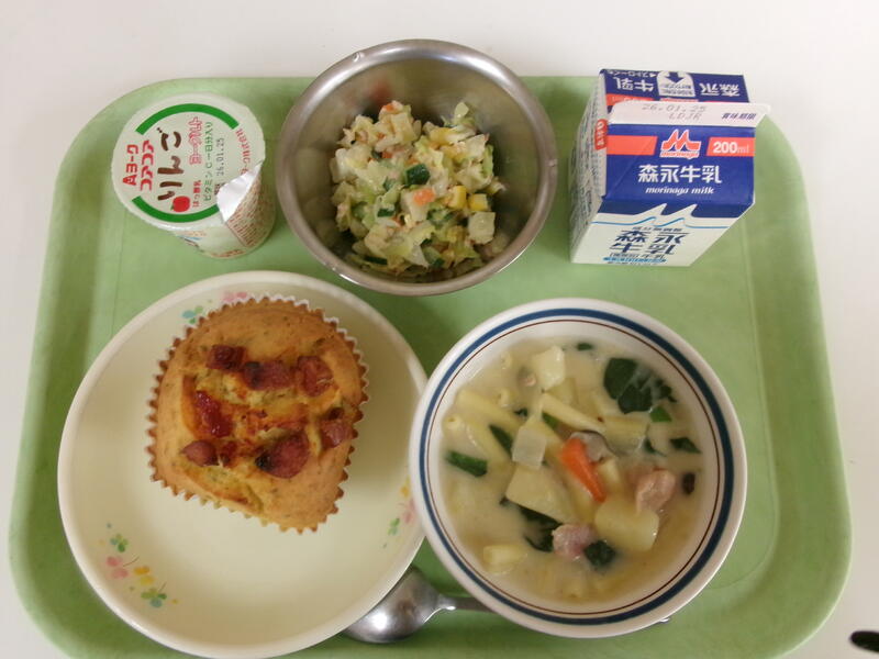 【ソーセージやきパン、牛乳、マカロニのクリーム煮、ツナサラダ、りんごヨーグルト)です。