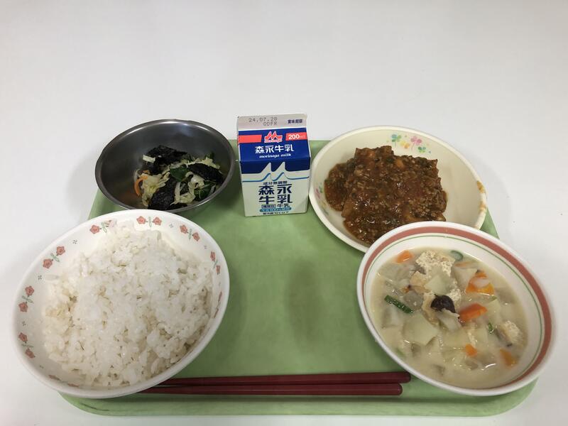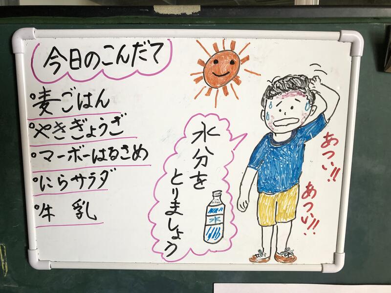 本格的に暑い日が続いています。こういう時は、食欲も落ちてしまいがちなのですが、今日は暑くとも食欲が落ちないメニューが並びました。やきギョーザ、マーボー春雨、にらサラダどれも町中華メニューでおいしくいただきました。牛乳もキンキンに冷えてこれまたよかったです!! 校 長