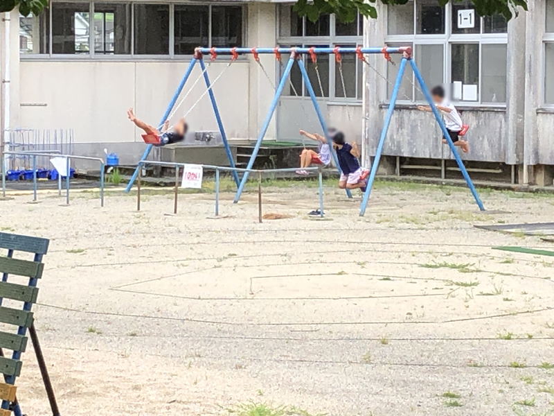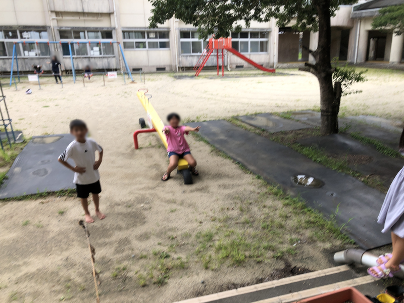 中庭の様子です。遊戯施設に取り付けていた張り紙が風により一部外れましたが、特に大きな変化はありません。