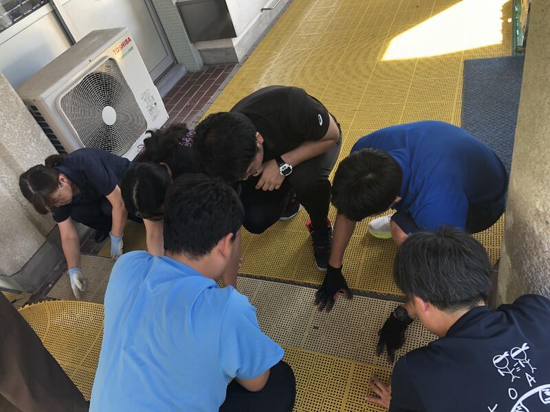 体育館の雨受け(バケツ・ジョーロ等)の撤去作業