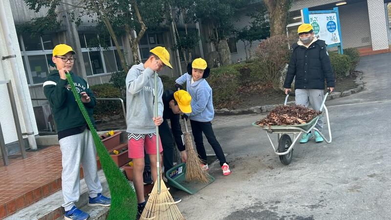 秋になり、学校の玄関脇には、多くの葉が落ちるようになりました。数名の先生方が、毎朝、掃いておりましたが、最近になって、環境委員さんと委員会の担当の橋口先生が、毎朝、落ち葉を掃いてくれています。とても気持ちがいいですね。