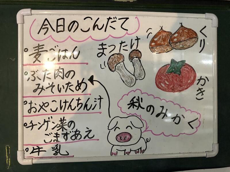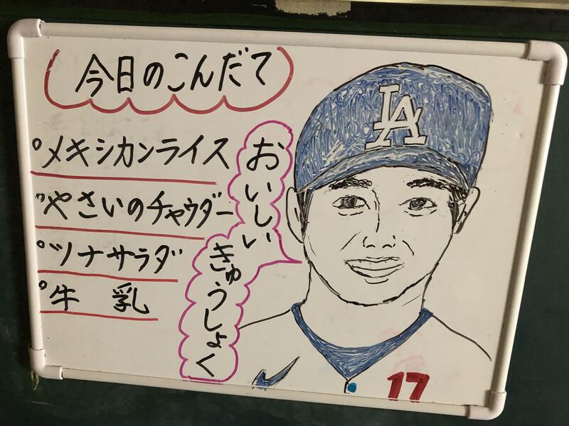アメリカでは、大谷選手がワールドシリーズ進出をかけて戦っています。エールを込めてのイラストでしょう。さて、今日の肉じゃがは、高野豆腐がナカナカいい味を出していました。とてもおいしかったです。春雨も酢がきいていておいしくいただきました。そして、大豆のりんかけ(黒糖)については、牛乳との口中調味で、ちょっとした「ミルメーク」風になりました笑笑・・・ところで、ミルメークって児童にわかるかなあ?