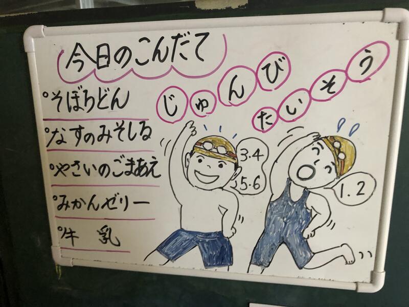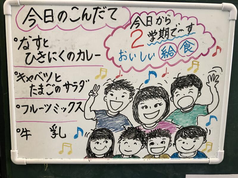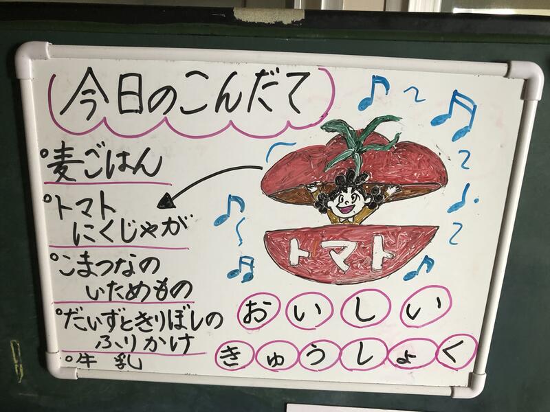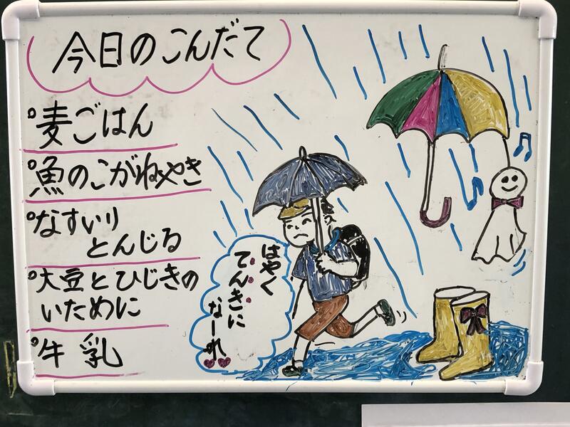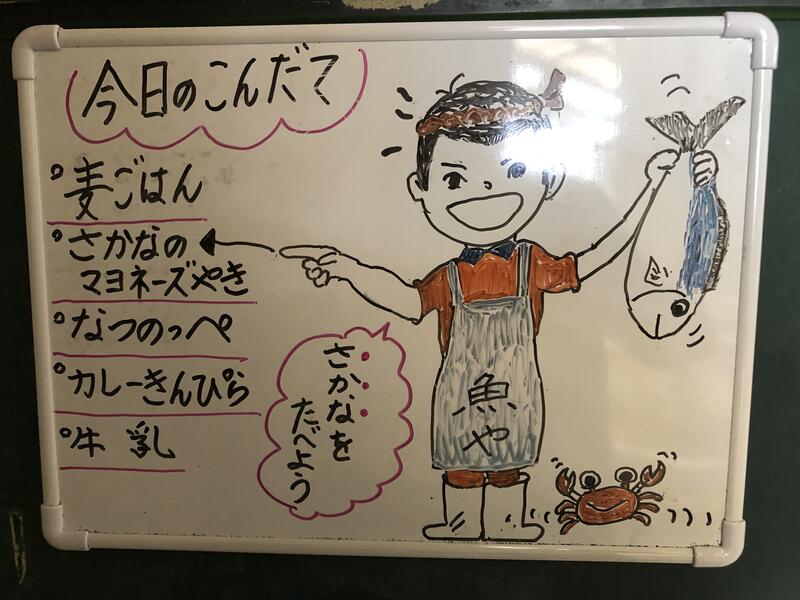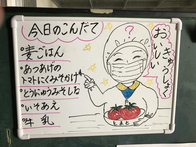 給食室に写真を撮りに行ってイラストを見てすぐに笑ってしまいました。今日もS先生からの、われわれへの挑戦状(謎人)です。今回の答は・・・ですよね?笑笑