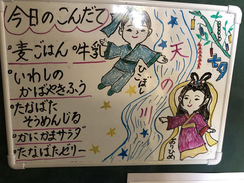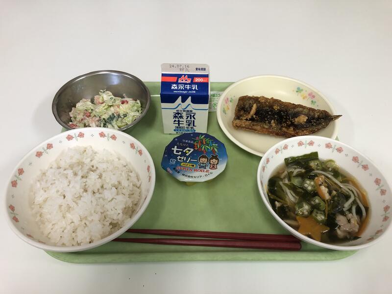 日曜日は七夕。今のところ、天気は良さそうですので2人は会うことができそうですね。かくいう私はロマンチックなうお座です。今日のデザートは、キンキンに冷えた「たなばたゼリー」これは今日の暑さにピッタリでした。そうめんじるも、星形に切ったたなばたバージョンで、疲労回復効果が期待できるオクラはこれまた暑い日に必須の食材です。かにかまサラダもいわしのかば焼きも食欲をそそる味ですべておいしくいただきました。 校 長