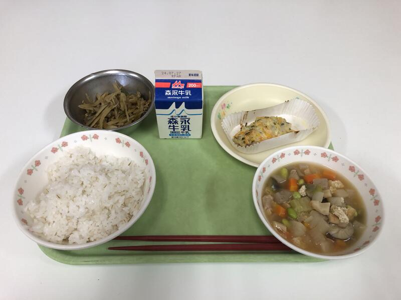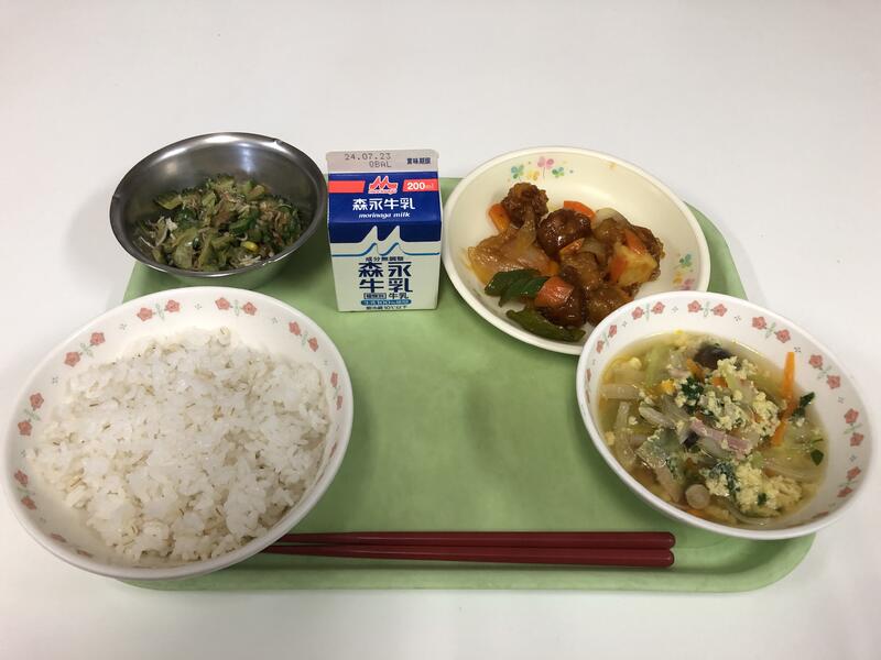 先週の給食日誌を見ていたら、残さいが多かった日があったようで「暑さのせいもあるのでしょうか」という記述がありました。食欲が落ちやすい季節ですが冷たい牛乳をうまく間に入れながら食べましょう。しっかり食べることが夏バテ予防につながります。