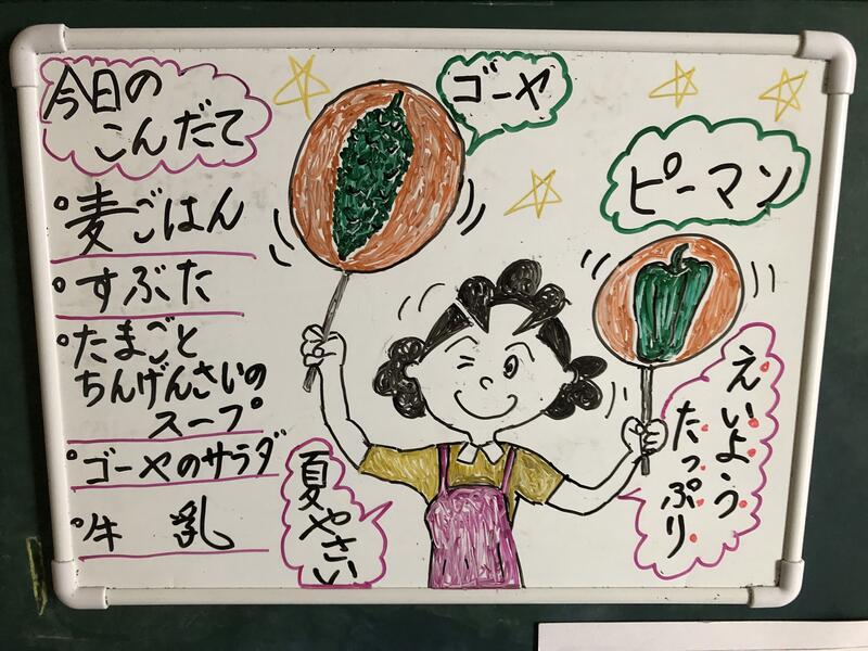 ゴーヤの苦さが際立ったサラダでした。子どもたちには少し苦かったかもしれません。私自身、大人になってからゴーヤの苦さが好きになりました。酢豚は喜んで食べたと思います。スープも具だくさんでおいしくいただきました。栄養は抜群メニューです! 校 長