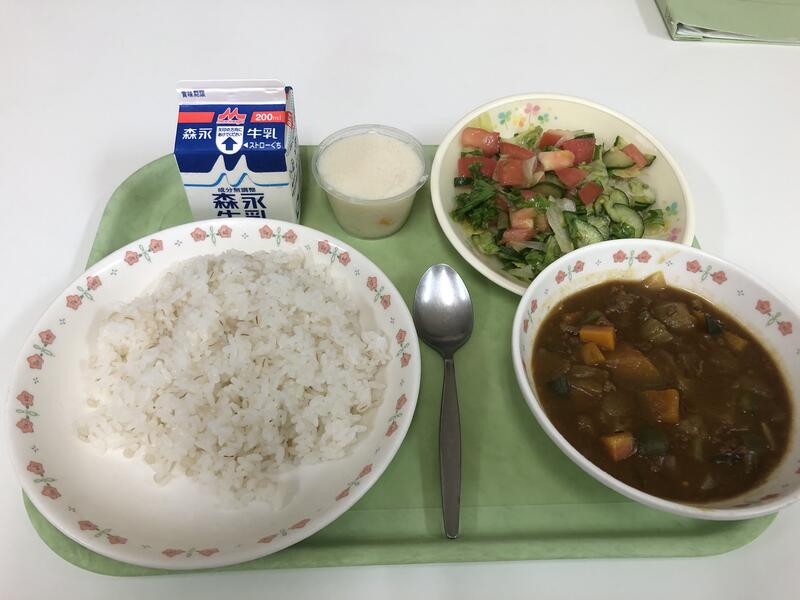 さて、本日のドライカレーは、ルーの甘みが絶妙でおいしかったです。また、マカロニサラダはマヨネーズ風味でこれまたおいしく、野菜たっぷりのチンゲン菜のスープを間においしくいただきました。 校 長