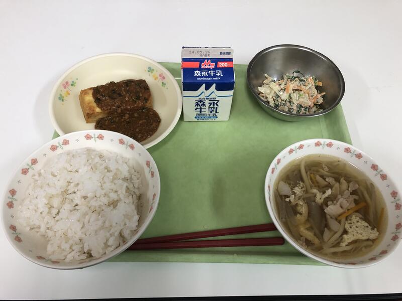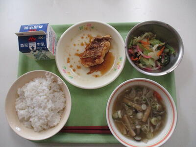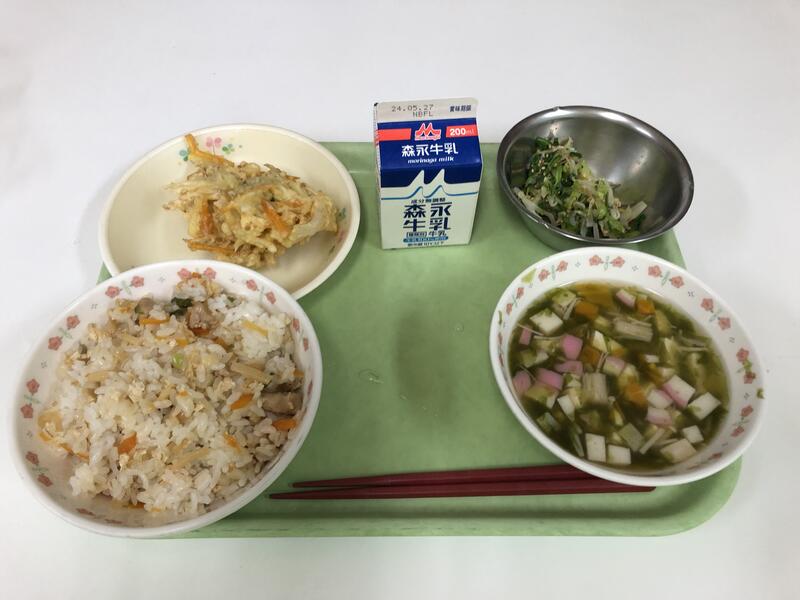 給食も2週目となり、調理員の先生方の作業時間も短くなってきました。先生方の日々のご苦労に敬意を表し、感謝します!今日は、特にさかなの磯部揚げがサイコーにおいしかったです。※「揚げ物」いつもおいしいです。たけのこごはんもずっしりと腹持ちがよく満足の一品でした。また、ちょうどすまし汁の塩加減とマッチしていた感じでした。校 長