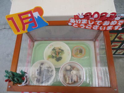 さて、1月の給食展示食の飾りつけは、初日の出やミニ門松です。これも給食の先生方が作ってくださいました。ありがとうございました。
