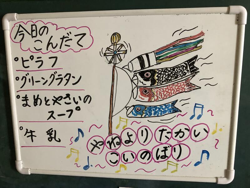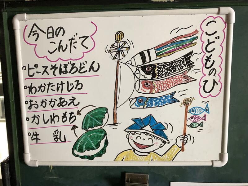 明日から4連休ということで既にテンションが高くなっている人もいるでしょう。GW前にぴったりのメニューが出そろいました。そぼろ丼はいつも以上にご飯が進みました。わかたけ汁との相性も抜群です。おかかあえもカツオ節の風味が効いておいしかったです。そしてシメはかしわもちでスイーツ気分。大満足のメニューでした。校 長