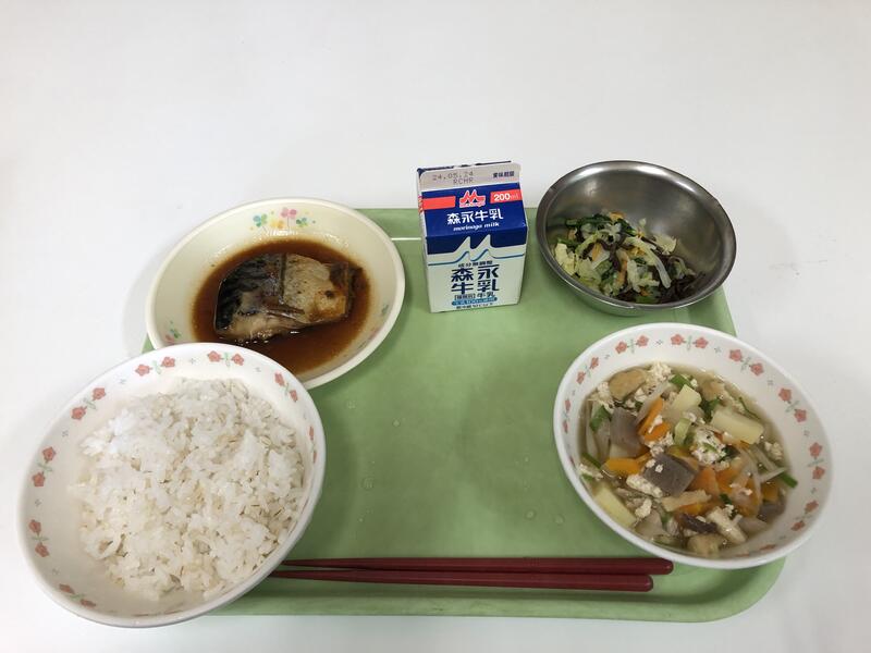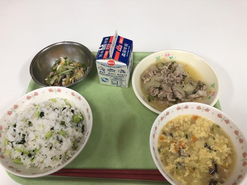 今日のメニューは、カルシウムのオンパレードという印象をもちました。まず、いりこ・・・これは有名です。そして、きくらげはビタミンDとカルシウムの宝庫、小松菜は低カロリーでビタミンK(カルシウムの対外排出を防ぐ)とカルシウムを両方含む優秀な野菜です。今日も具だくさんのメニューが出そろい、満足の給食でした!!