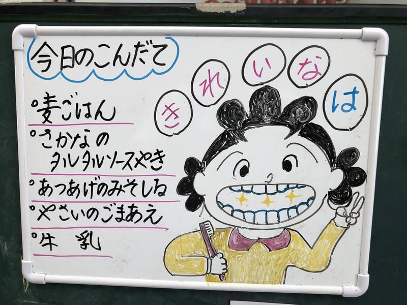 今日は、6月4日「虫歯予防デー」ということで給食室のイラストもこうなりました。歯がシッカリしてこそ食事も美味しく食べることができます。歯を大切にすることは食育にもつながります。
