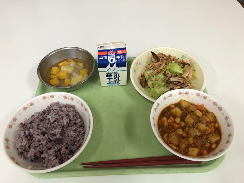 今日は午後イベントで子どもたちが早く下校するときの定番メニューのハヤシライスでした。フライングして牛乳を一口飲んだ後に撮影してしまったので、口が開いてます苦笑