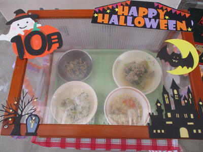 10月の展示食の飾りは、ハロウィーンです。楽しい気持ちになりますね。