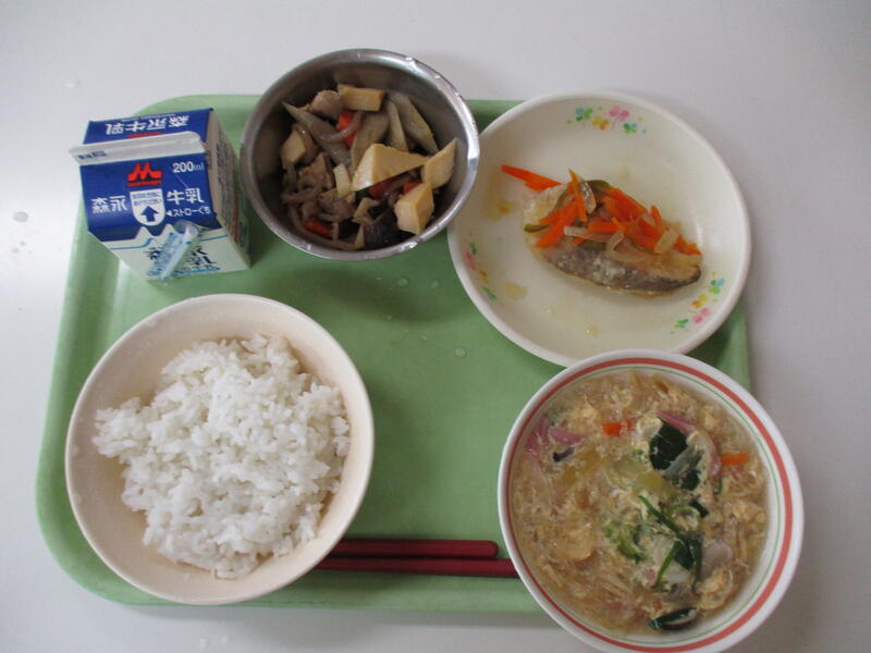 麦ごはん 牛乳 魚の香味焼き 根菜のゴマ汁 小松菜と大豆そぼろの和え物