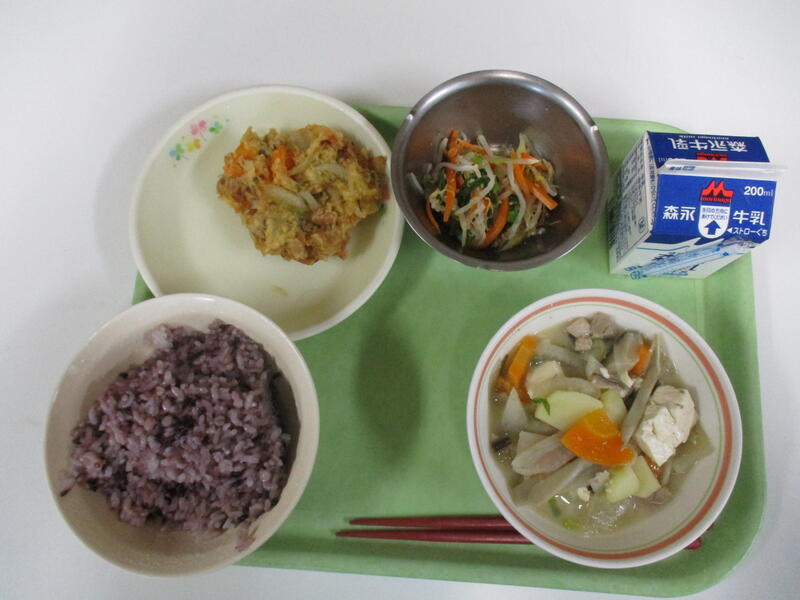 赤米ご飯 牛乳 大豆とちりめんのかき揚げ 味噌けんちん汁 しめじのゴマ酢和え