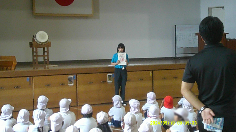 ここでサプライズゲストの登場に子どもたちから大きな拍手が送られました。昨年度まで本校に勤務していたY先生です。現在の5年生を昨年担任していました。校長に忖度して(笑)「こ・ん・に・ち・はー」で登場、あいさつをされました。彼は本HPのヘビーウオッチャーでもあります!