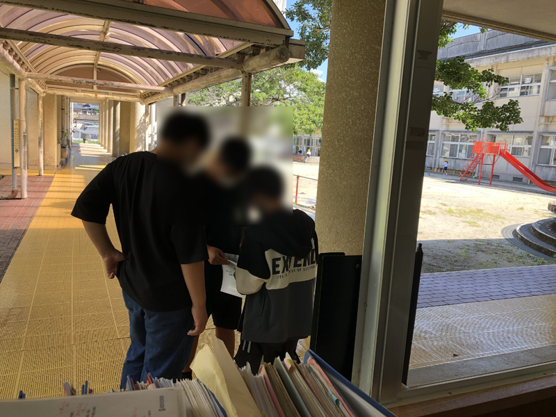 潤徳小学校の閉校記念誌に興味を示し、眺めた3人