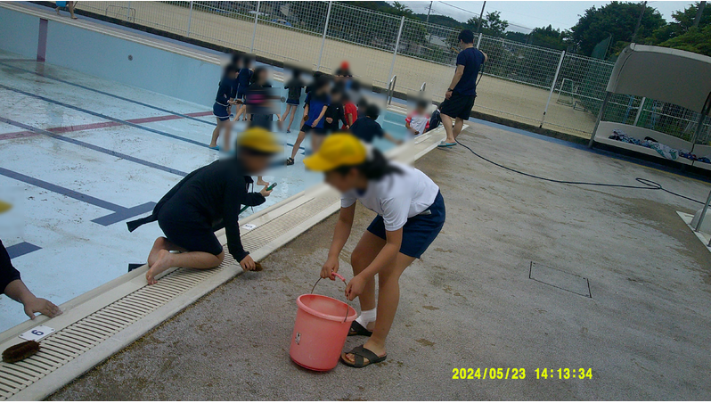 6月3日(月)のプール開きを控え、本日の午後にプール掃除を行いました。プールの中央部はこんな感じでした。今日、本当に終わるのか??少々不安になってきました。