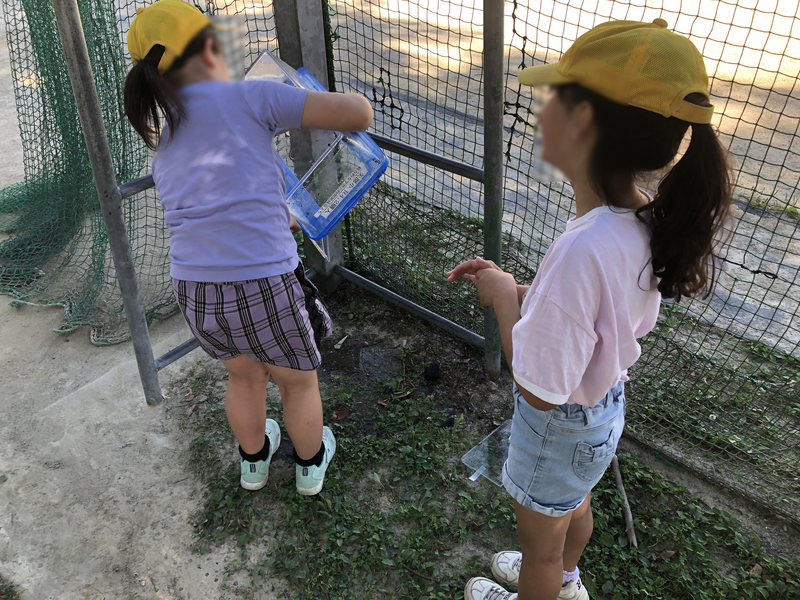 子どもたちアルアル。虫をつかまえると必ず見せに来ます。また取った草を丁寧に巻いていく子もいました。「一箇所に集めておかないとあとで草を持っていくのが大変になるよ」と教えてあげました。