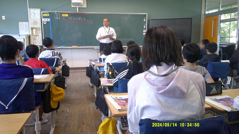 今日も熊日新聞社からお2人をお招きして、出前授業をしていただきました。今日は、前回の記者会見の様子を模擬新聞記事にして持ってきていただき、それを教材とした授業でした。