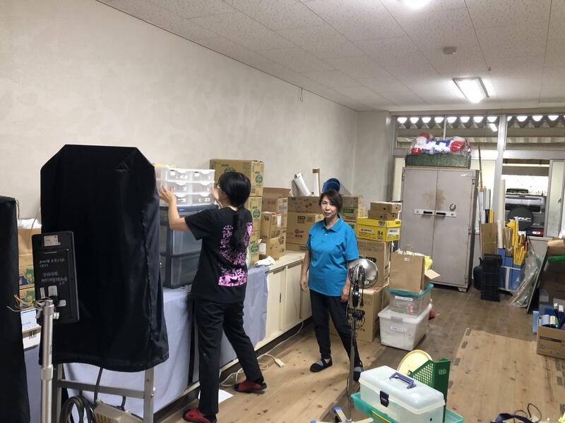 体育館の雨受け(バケツ・ジョーロ等)の撤去作業