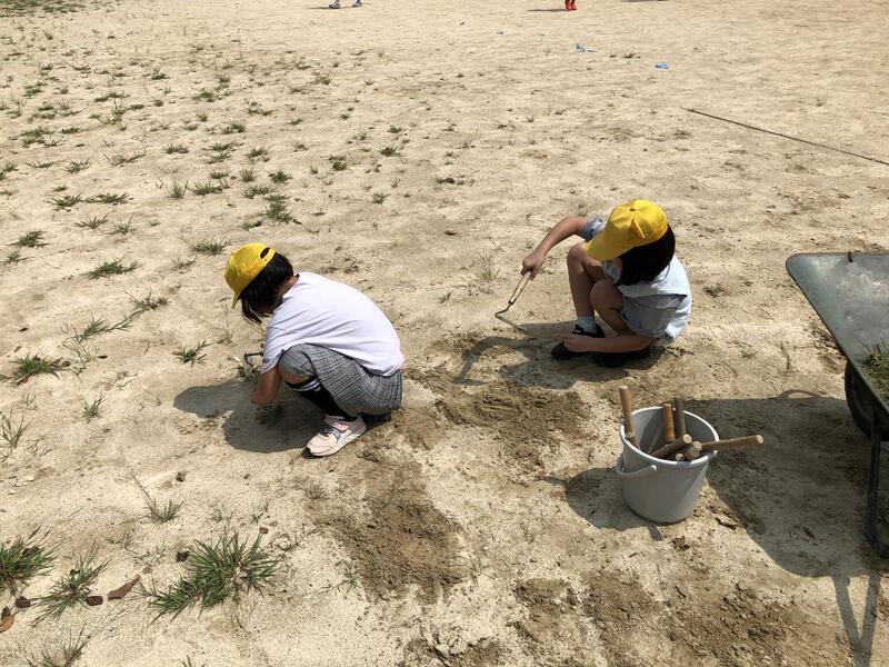 子どもたちアルアル。虫をつかまえると必ず見せに来ます。また取った草を丁寧に巻いていく子もいました。「一箇所に集めておかないとあとで草を持っていくのが大変になるよ」と教えてあげました。