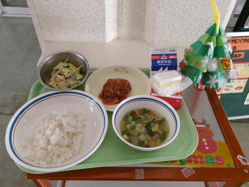 【麦ごはん、牛乳、豆腐ハンバーグデミソース、野菜スープ、ミックスサラダ、クリスマスケーキ】