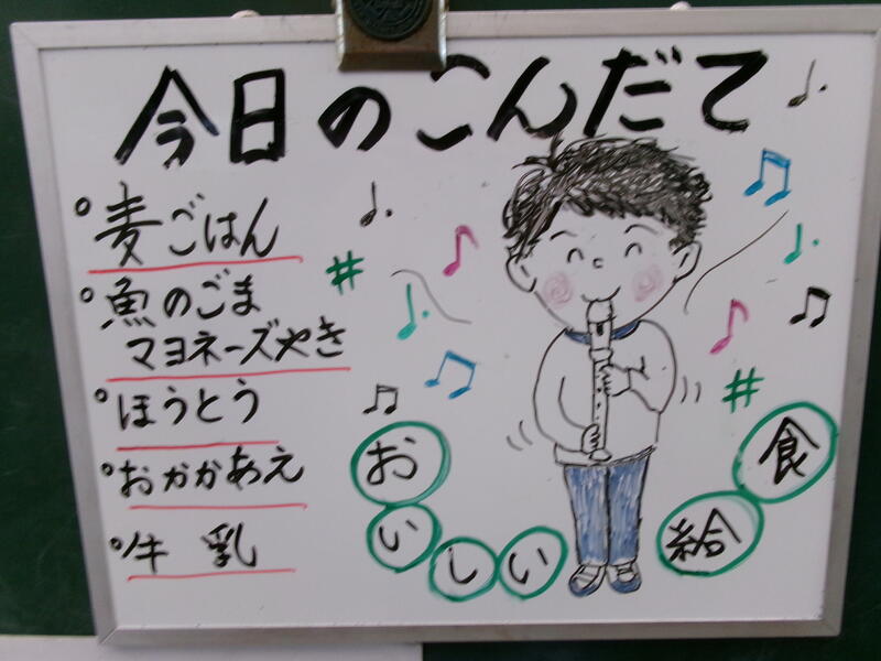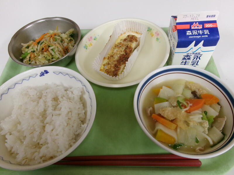 今日の給食は【麦ごはん、牛乳、魚のごまマヨネーズ焼き、ほうとう、おかか和え】です。