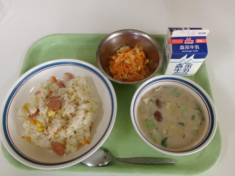 今日の給食は【ピラフ、牛乳、ニョッキ入りきのこスープ、人参サラダ】でした。