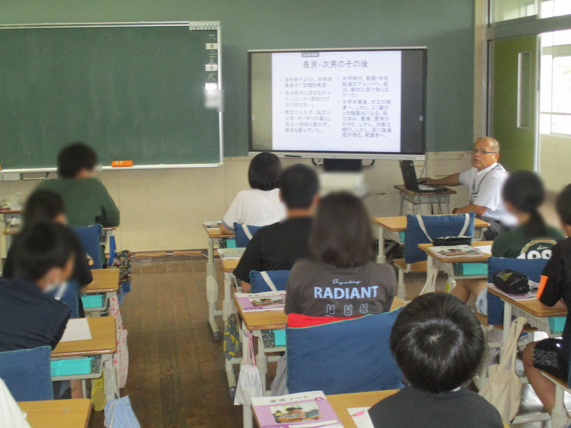 昼食の模様は矢部小にライブ配信しました。その後、原爆資料館ホールにて平和講話を聴きました。講師はJさんです。6歳当時に爆心地から2.4km離れた山蔭で被爆されました。私自身は、昨年に引き続きお話を聴くのは2回目です。