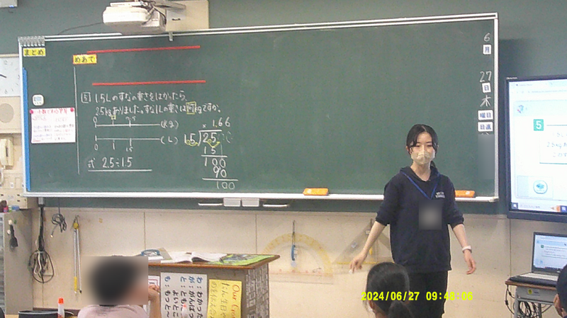 こちらでは、2つの式を比較して小数わり算の不思議さを感じさせる興味深い内容でした。ここで「めあて」を設定します。