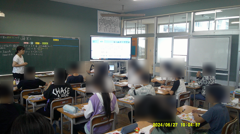 子どもたちみんなが気づいて私のところに説明に来ました。そのことを確認後、先生が児童と一緒に筆算の仕方を確認しながら解説を加えました。中学校数学では「無限小数」という内容で、3年生で学習します。