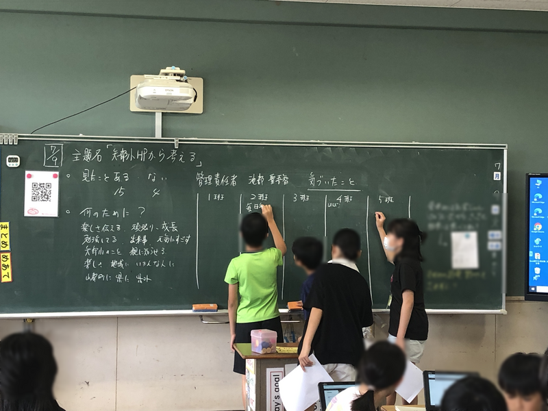 「1人1台端末」の利を生かし、今日は実際に各自HPを眺めてもらいながら授業を実施しました。上の写真は、黒板に掲示した2次元コードから各自HPを読み込んでいるシーンです。これも必要な「スキル」です。