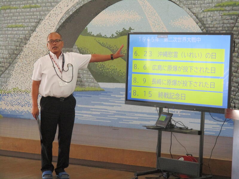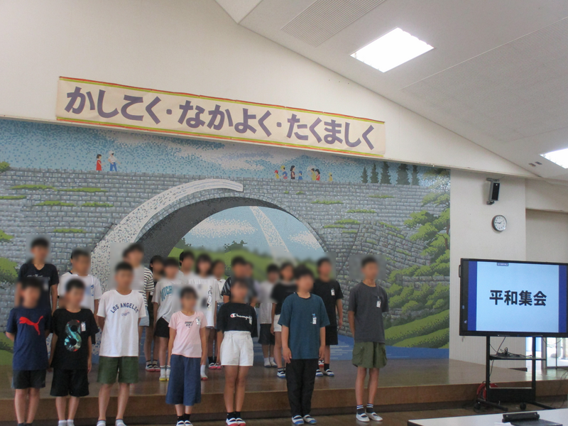 今日は、6年生の「修学旅行での学び」がメインですので、私からは「忘れてはならない4つの日」に焦点を絞って話をしました。その後、長崎・広島の平和登校日でよく歌われている「青い空は」の曲を紹介しました。