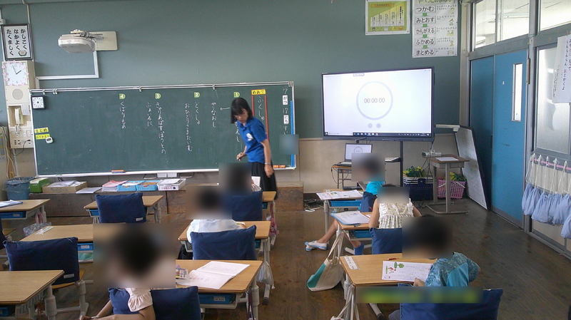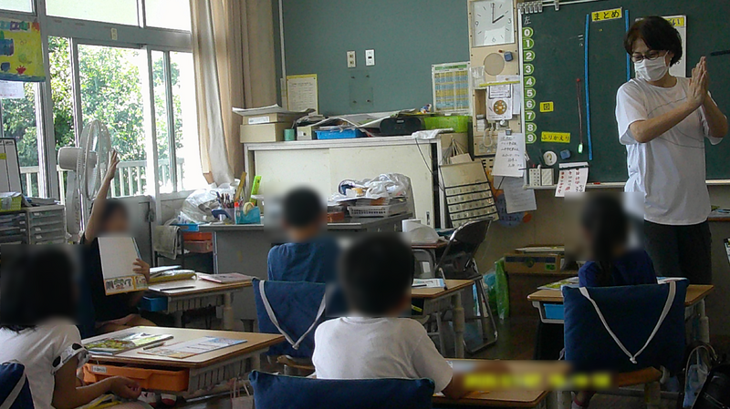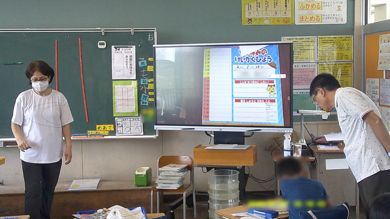1の2 担任が、拡大機を使いながら丁寧に夏休みのくらしについて説明をしていました。