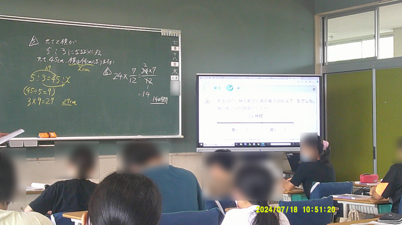 多くの子が、板書右の解法、もしくは24÷12=2、2×7=14 14時間 で解いていました。
