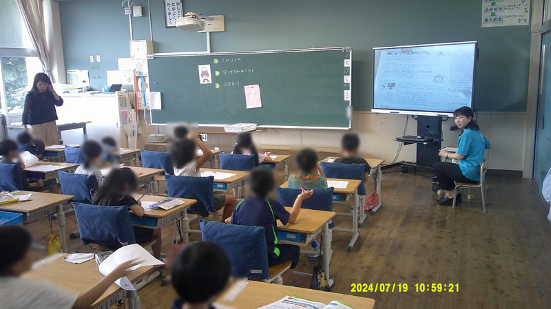 1の2 担任が、拡大機を使いながら丁寧に夏休みのくらしについて説明をしていました。