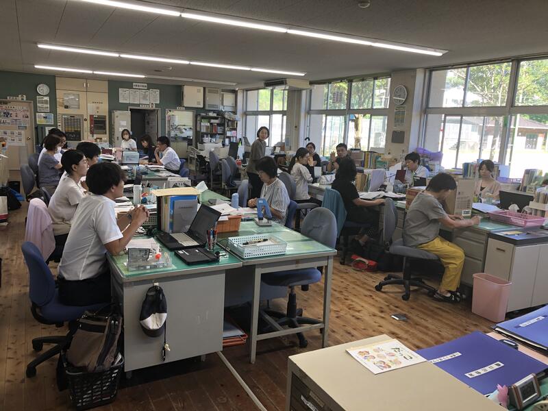 夏休みに入って6日目。今日は朝の様子をお知らせします。朝8:30に出勤した職員は職員室に集合して打ち合わせをしています。進行は日直の先生がします。