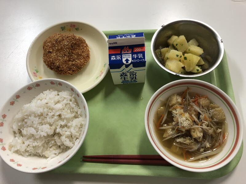 「ぎょろっけ」はネーミングがうまい(コロッケと掛けた)と思いました。今日は、別メニューとしてジャガイモがあります。どんな味かなと思ったら、コロッケの食感とは全く違う新鮮な噛み心地と味でした。そこがヒットしました。また、沢煮椀は今回の給食ではシンプルな汁物でしたが、限られた食材の中で深い味わいのある仕上がりでした!