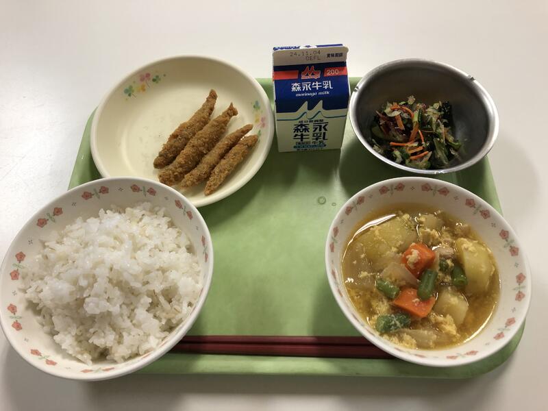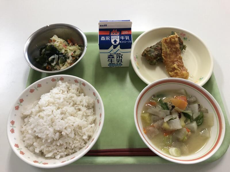 ちくわの二色揚げは、間違いなく好きな子が多いメニューの一つでしょう。黄色いほうは、カレー粉を衣に混ぜたもので、緑色のほうは、青のりを衣に混ぜたものです。とてもおいしいです。味噌汁は、根菜&さつまいもの食物繊維で腸を掃除する働きがありますので「便秘解消」にも効果がありそうです!酢の物も、シャキシャキ食感を楽しみながら酸味もほどよく、おいしくいただきました。