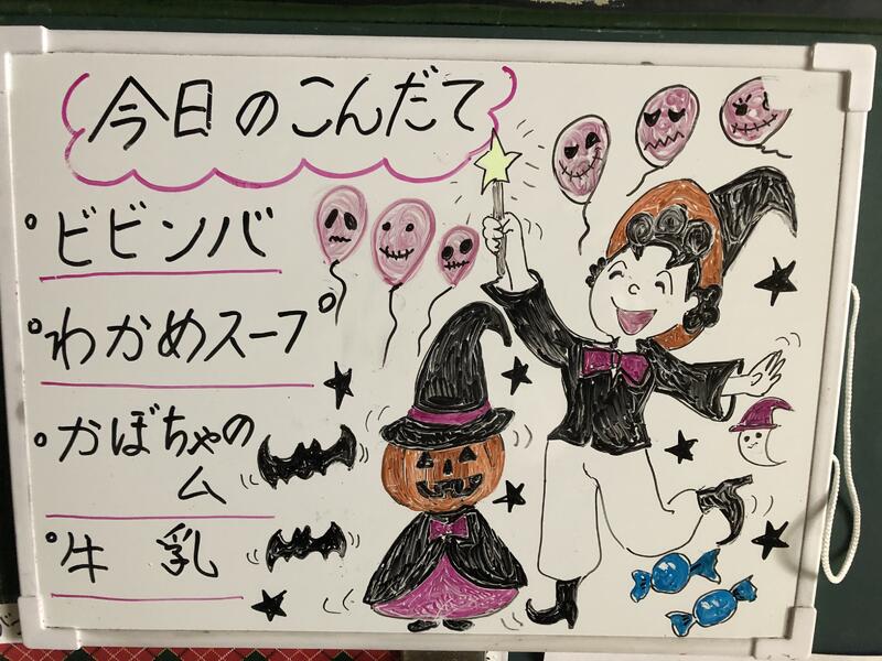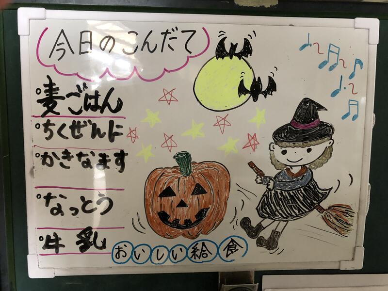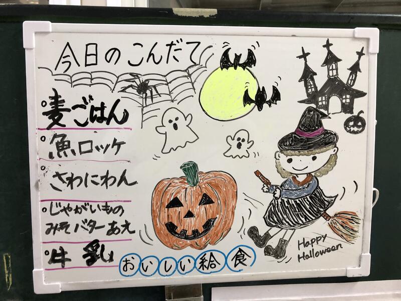 今日はハロウィン。給食時は、先生の声当てクイズに出演した後に、全クラスを・・・姿で回りました。(※その模様のワンシーンはブログにて)
