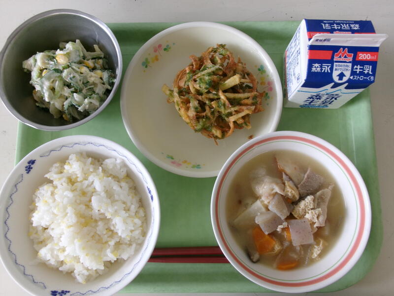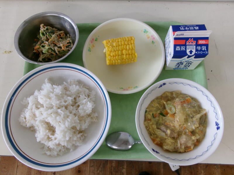 今日の給食は、【柳川風どんぶり、牛乳、ツナと小松菜のごまあえ、ゆでとうもろこし】です。